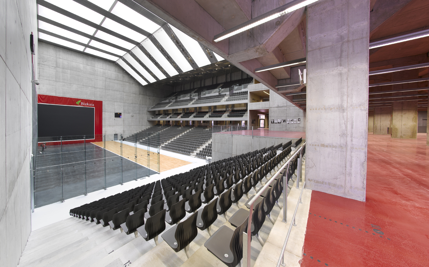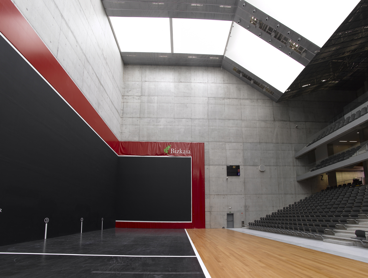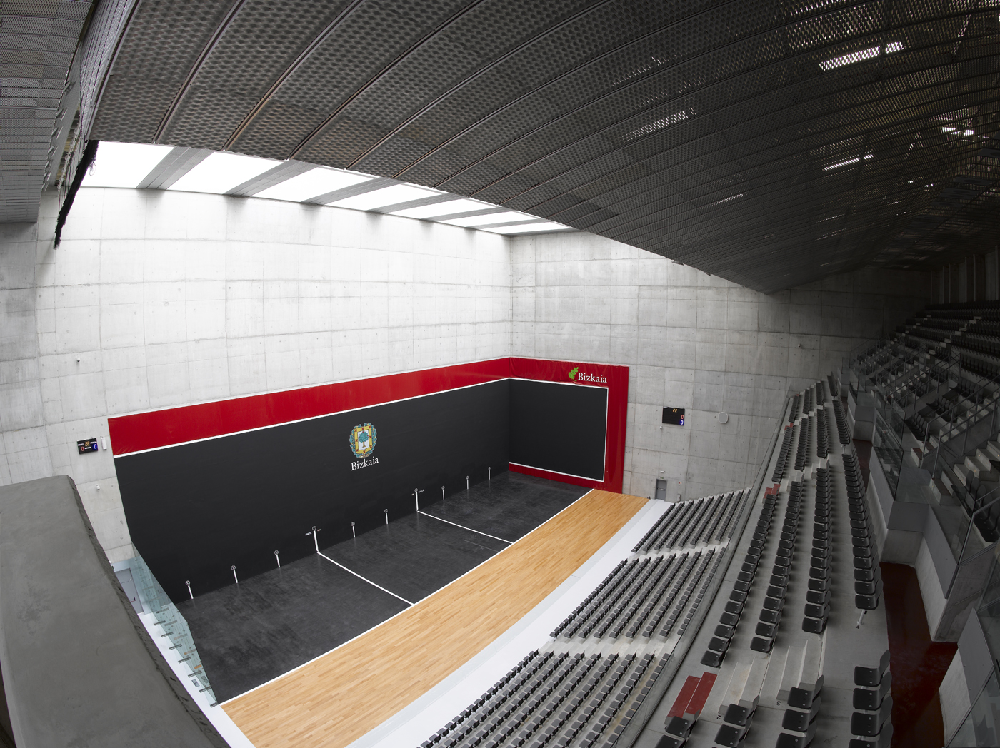 Inside, the building unfolds as an open and interconnected spatial landscape, where circulation routes, spectator areas and sports spaces interrelate through diagonal views and sloped planes generated by the stands. The main fronton, with a capacity of approximately 3,000 spectators, is one of the largest hand-pelota courts in the Basque Country and regularly hosts professional competitions and international tournaments.