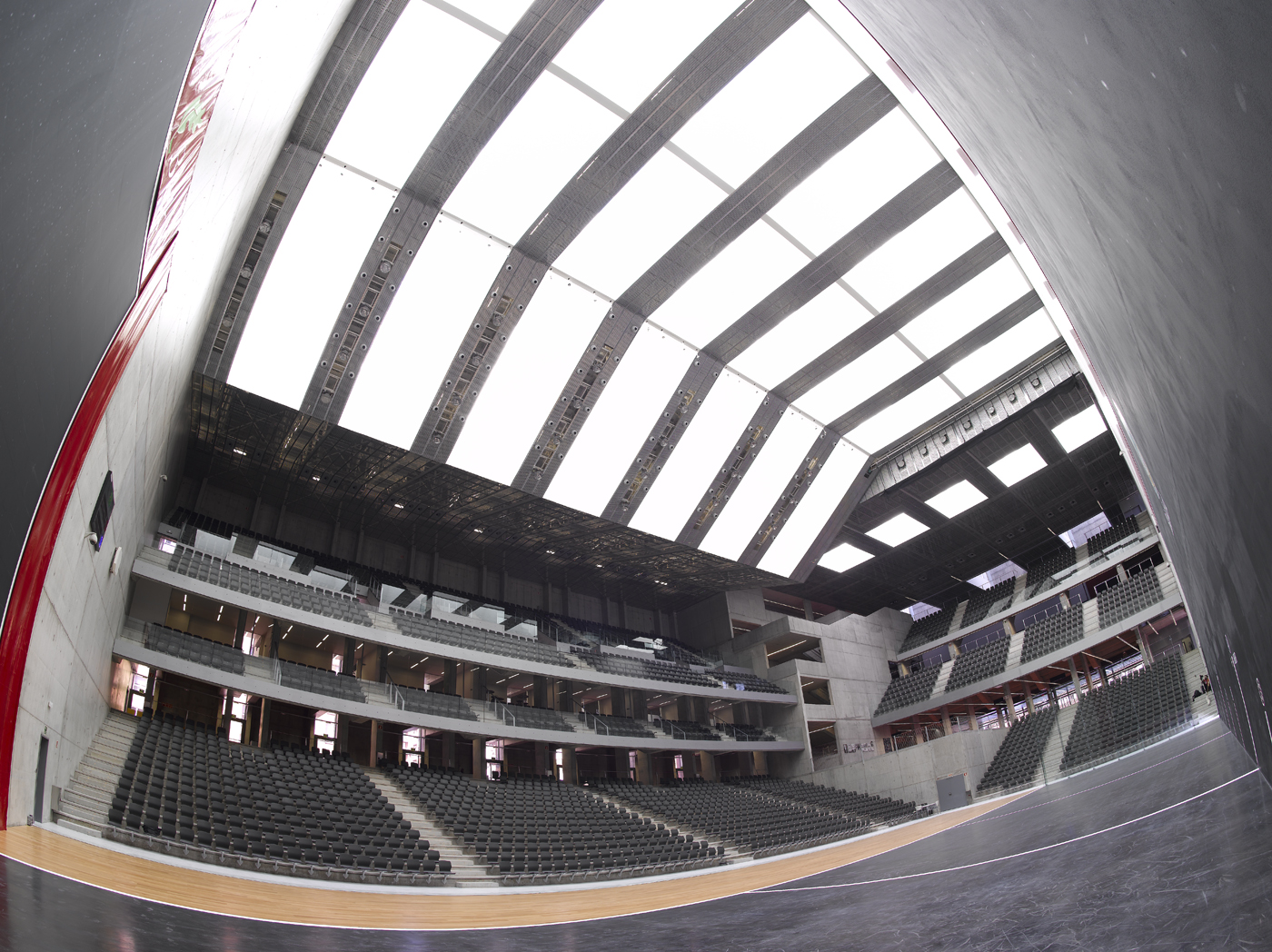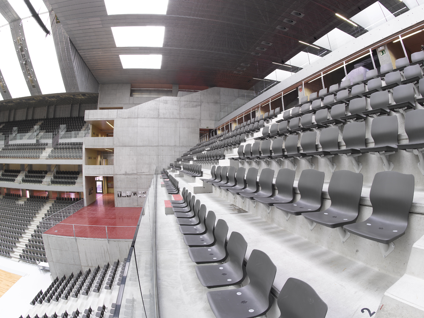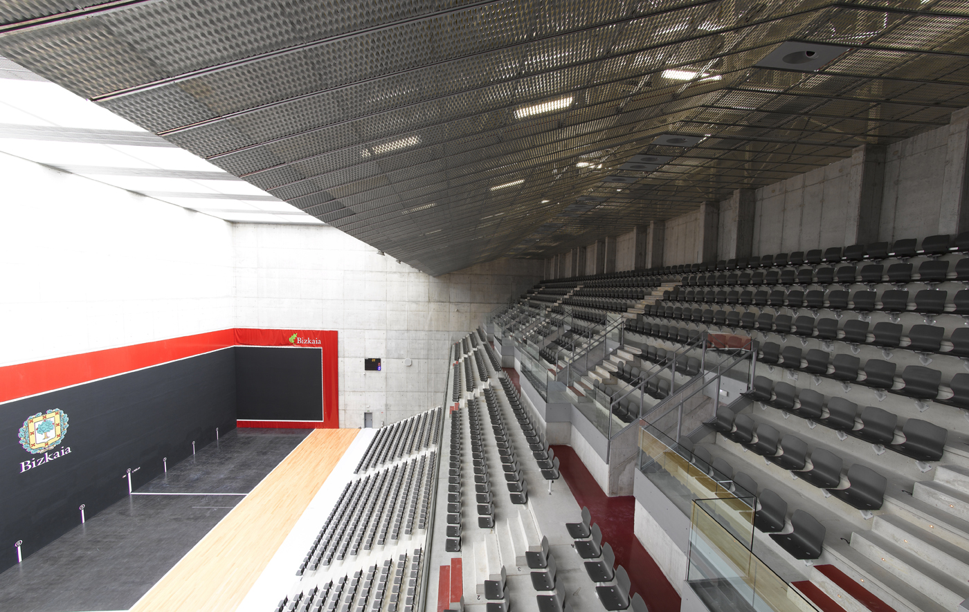 Inside, the building unfolds as an open and interconnected spatial landscape, where circulation routes, spectator areas and sports spaces interrelate through diagonal views and sloped planes generated by the stands. The main fronton, with a capacity of approximately 3,000 spectators, is one of the largest hand-pelota courts in the Basque Country and regularly hosts professional competitions and international tournaments.