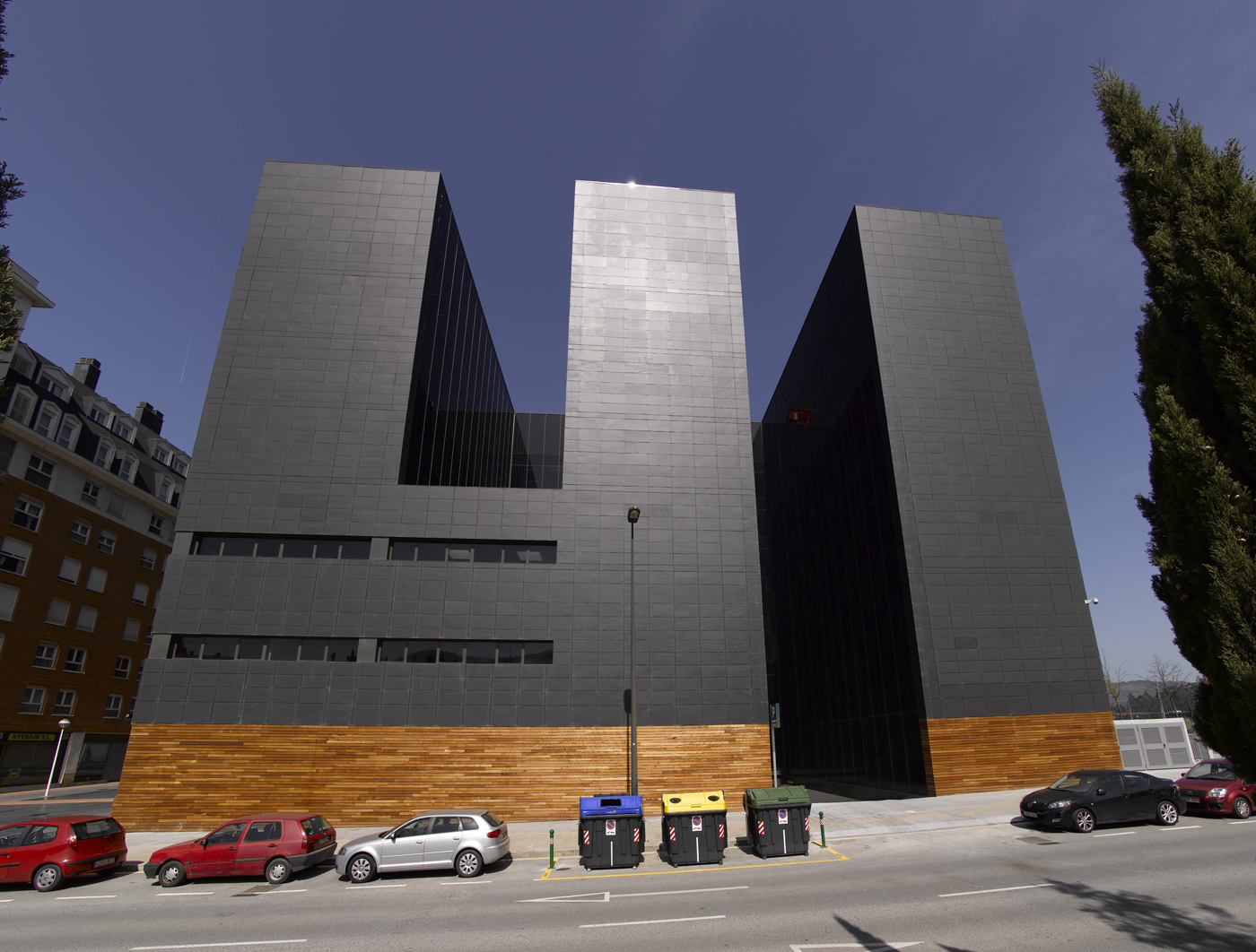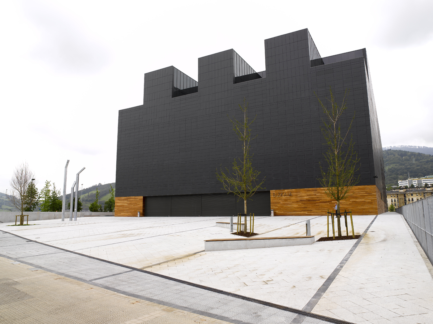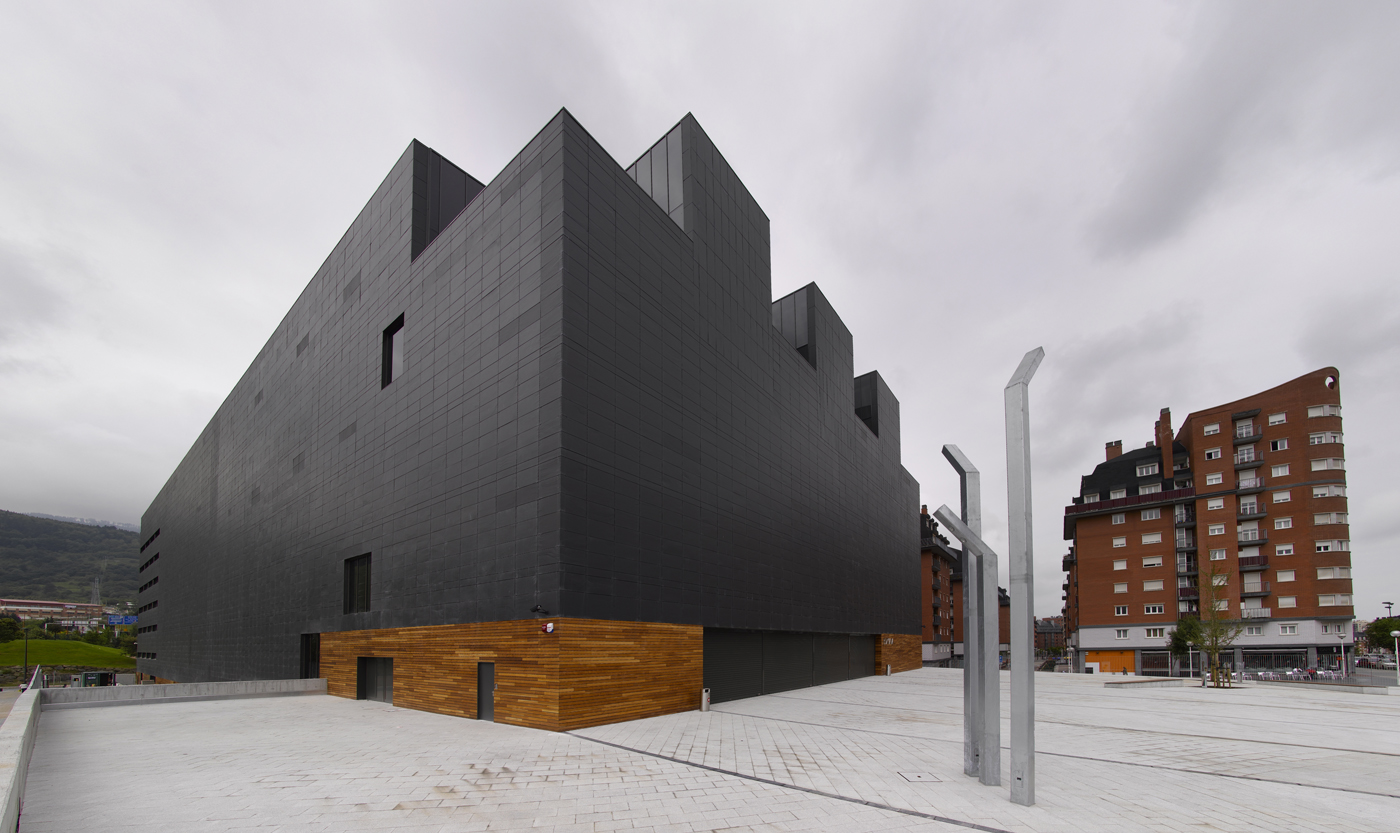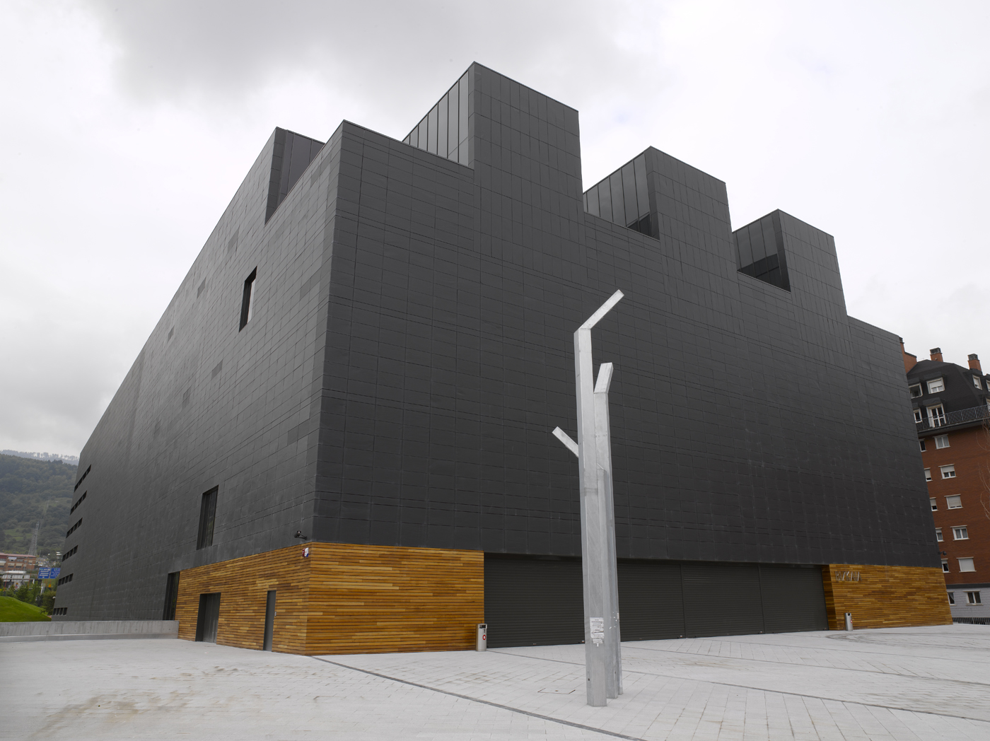 Architecturally, the building is conceived as a large monolithic parallelepiped, clad externally with dark slate panels that give the structure a sober and institutional character consistent with its role as the principal Basque pelota centre.